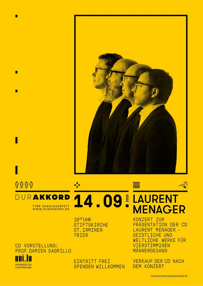 Das Vokalquartett DURAKKORD sang Lieder des luxemburgischen Komponisten Laurent Menager. Ein außergewöhnliches Konzert mit geistlichen und weltlichen Werken für vierstimmigen Männergesang. Die CD war direkt im Rahmen dieser Veranstaltung erstmalig erhältlich.